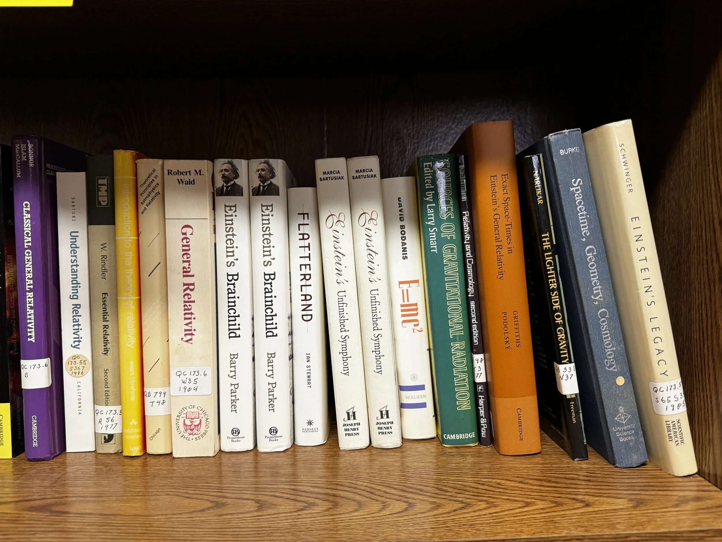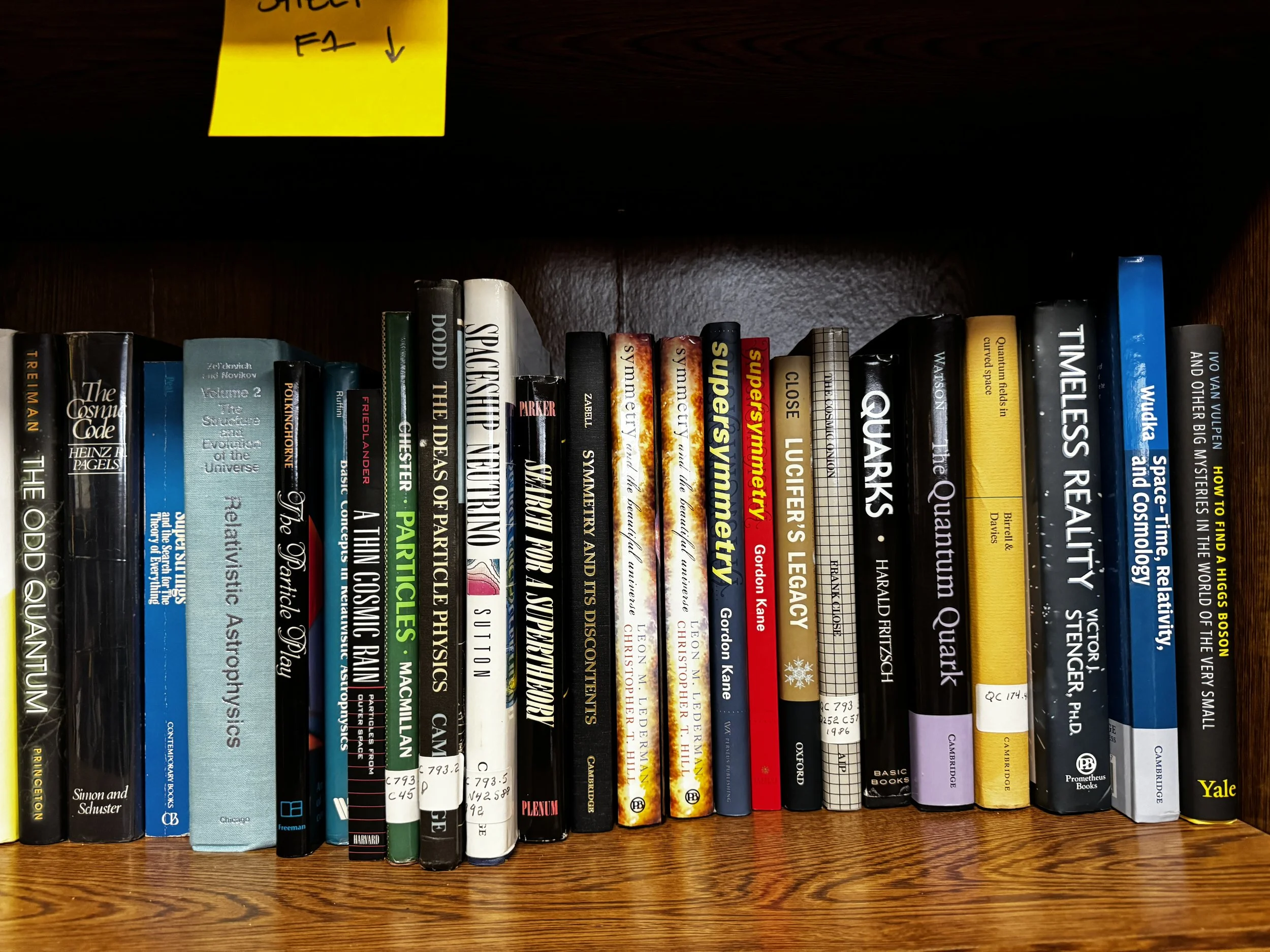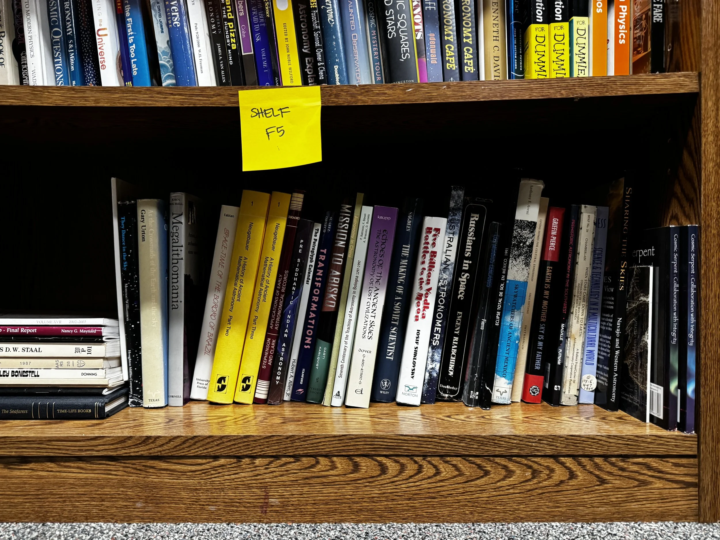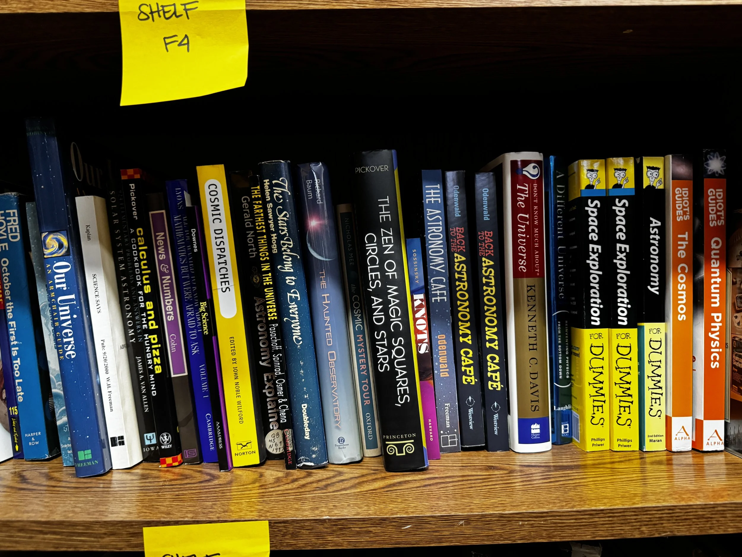 Bookcase F includes: quantum mechanics, relativity, Einstein, time, light, general pop-sci astronomy books, and multicultural astronomy books.