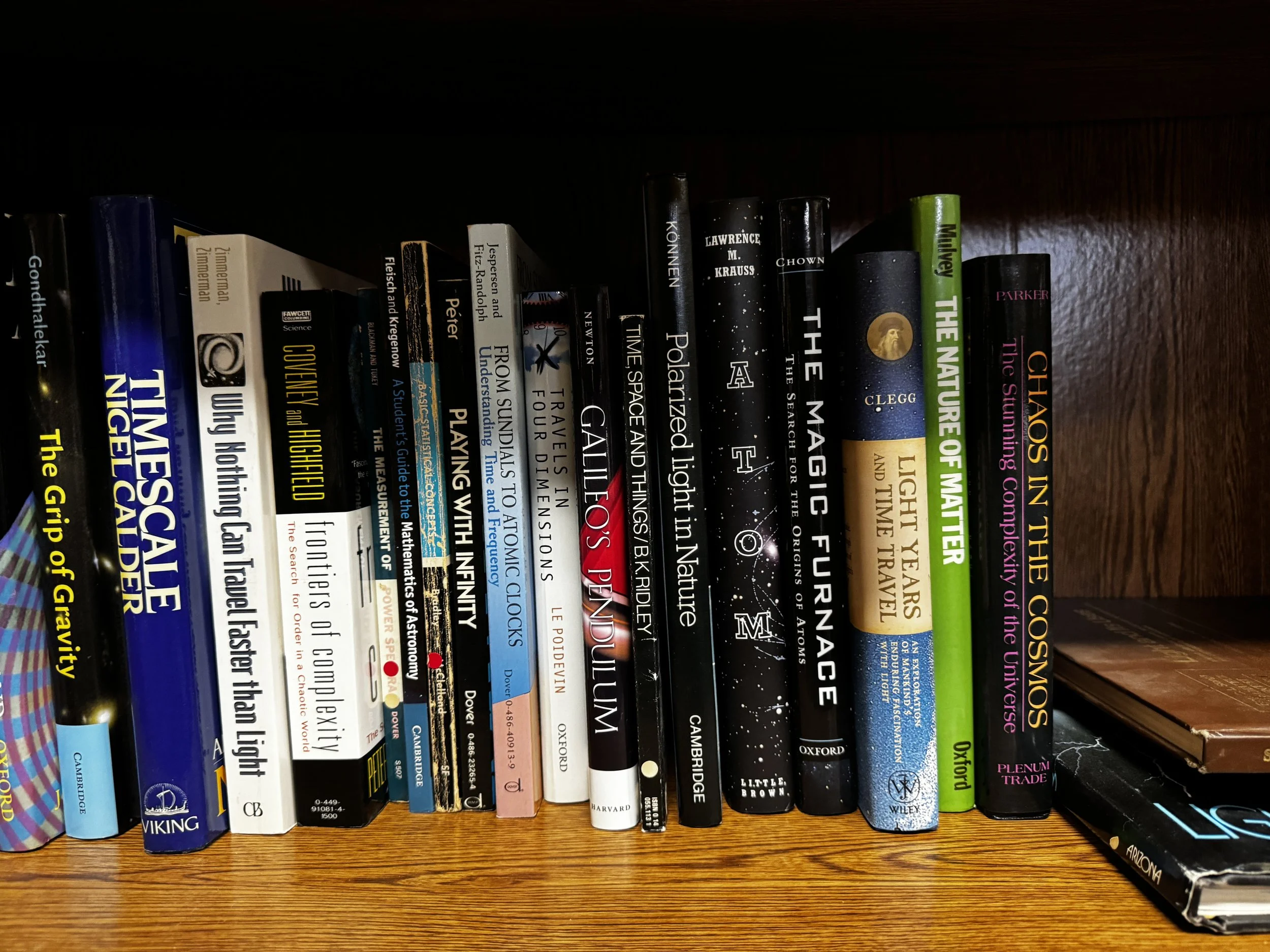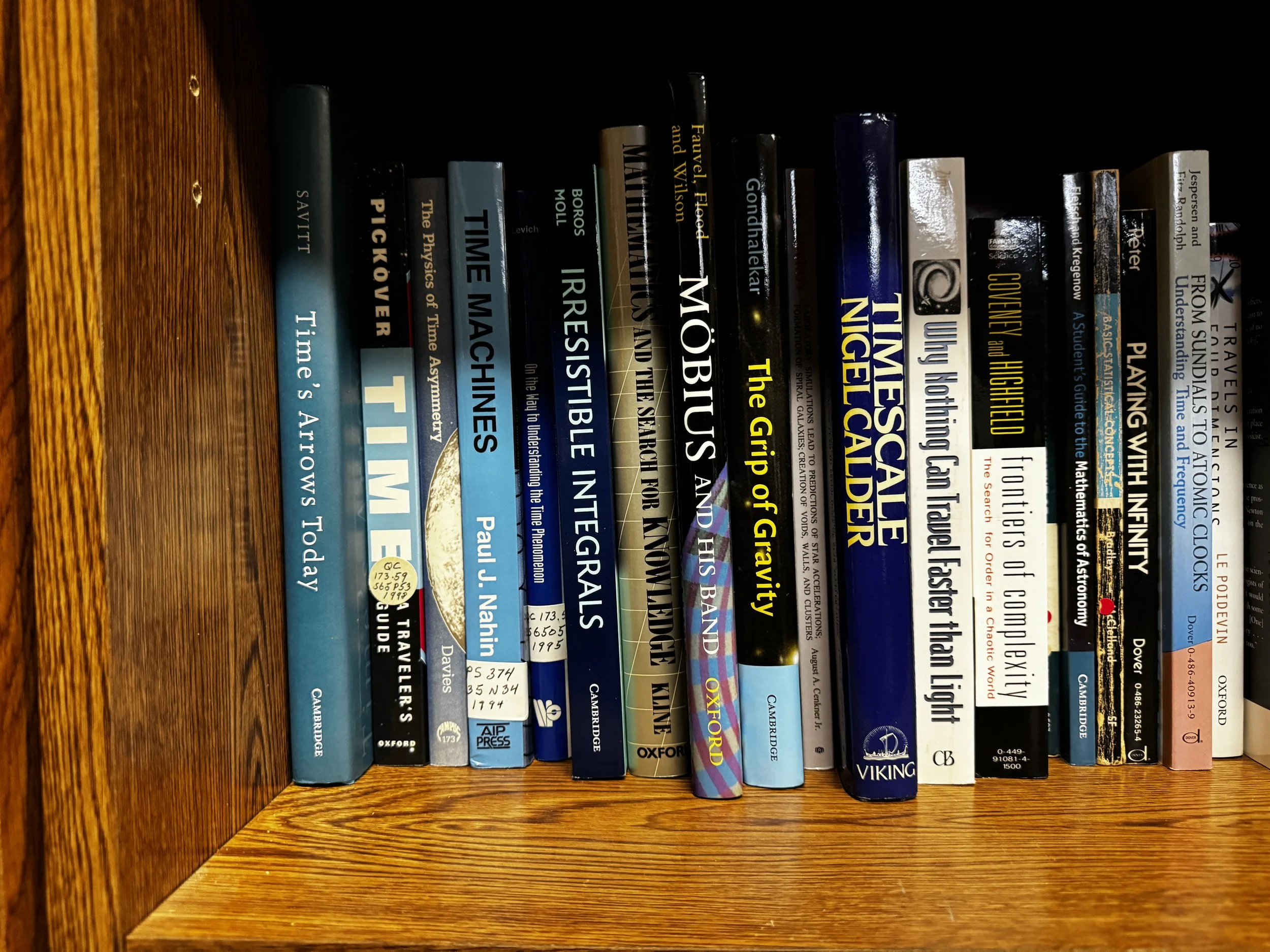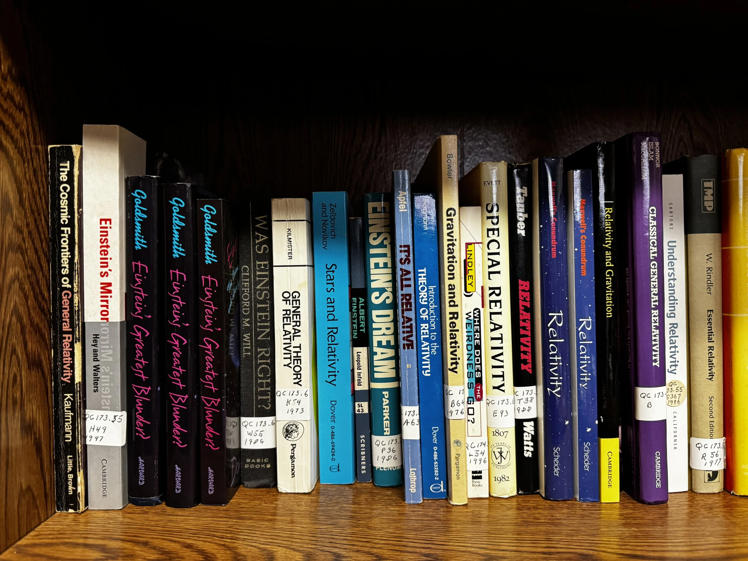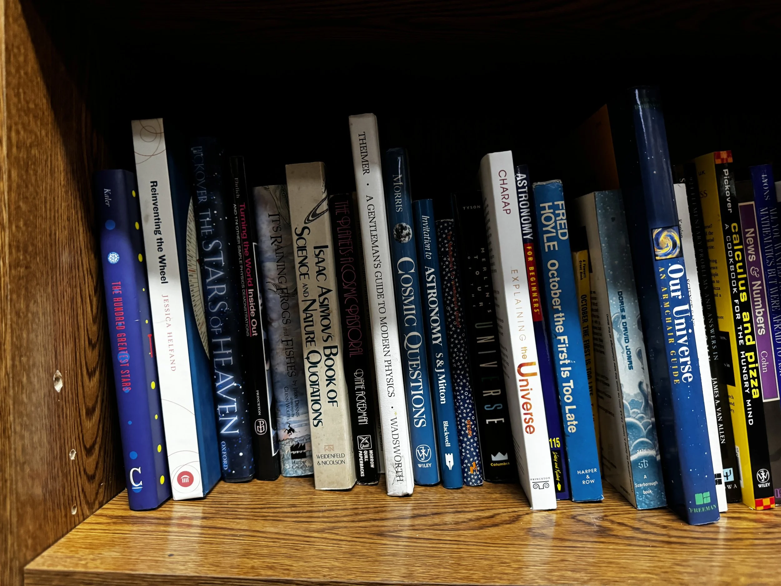 Bookcase F includes: quantum mechanics, relativity, Einstein, time, light, general pop-sci astronomy books, and multicultural astronomy books.