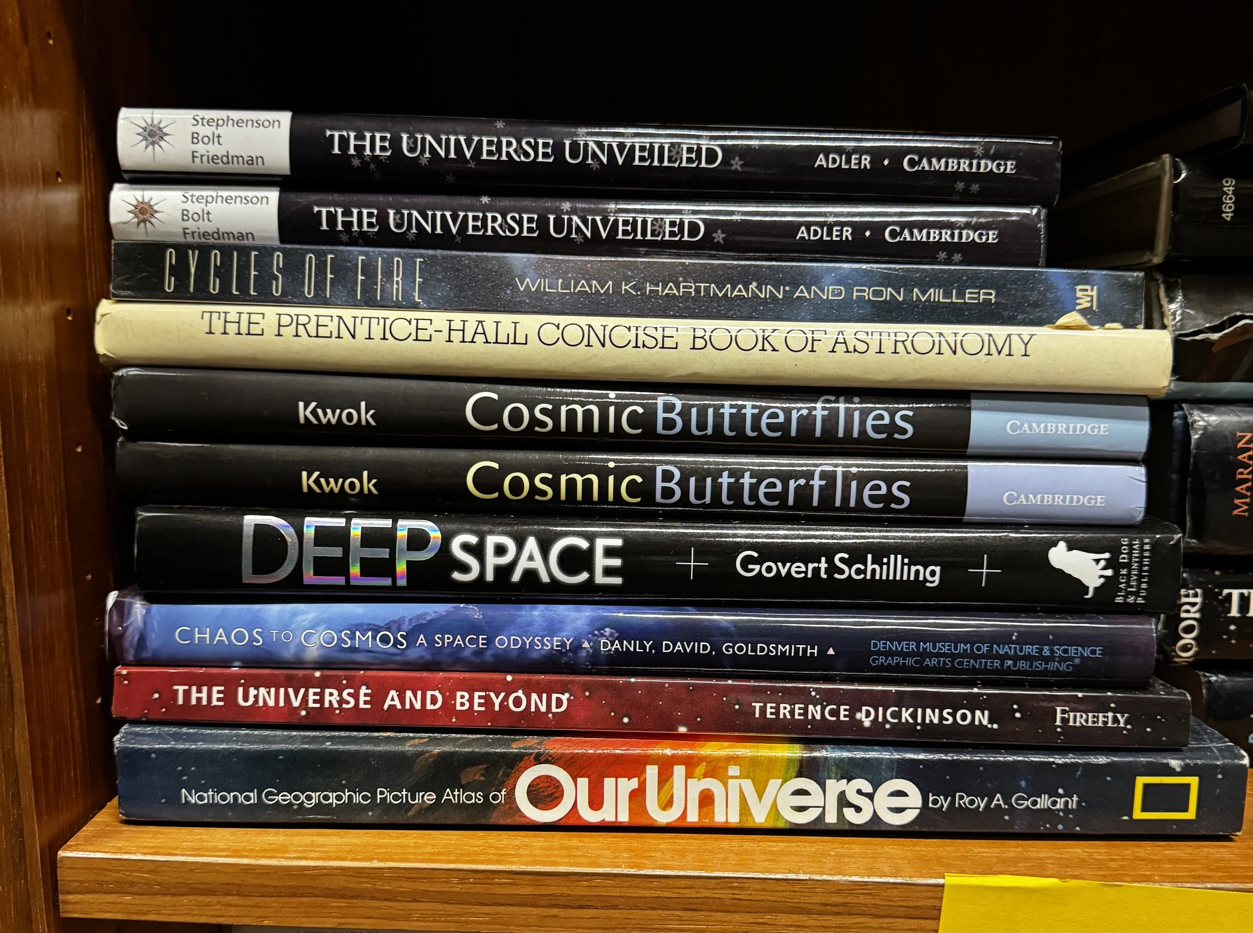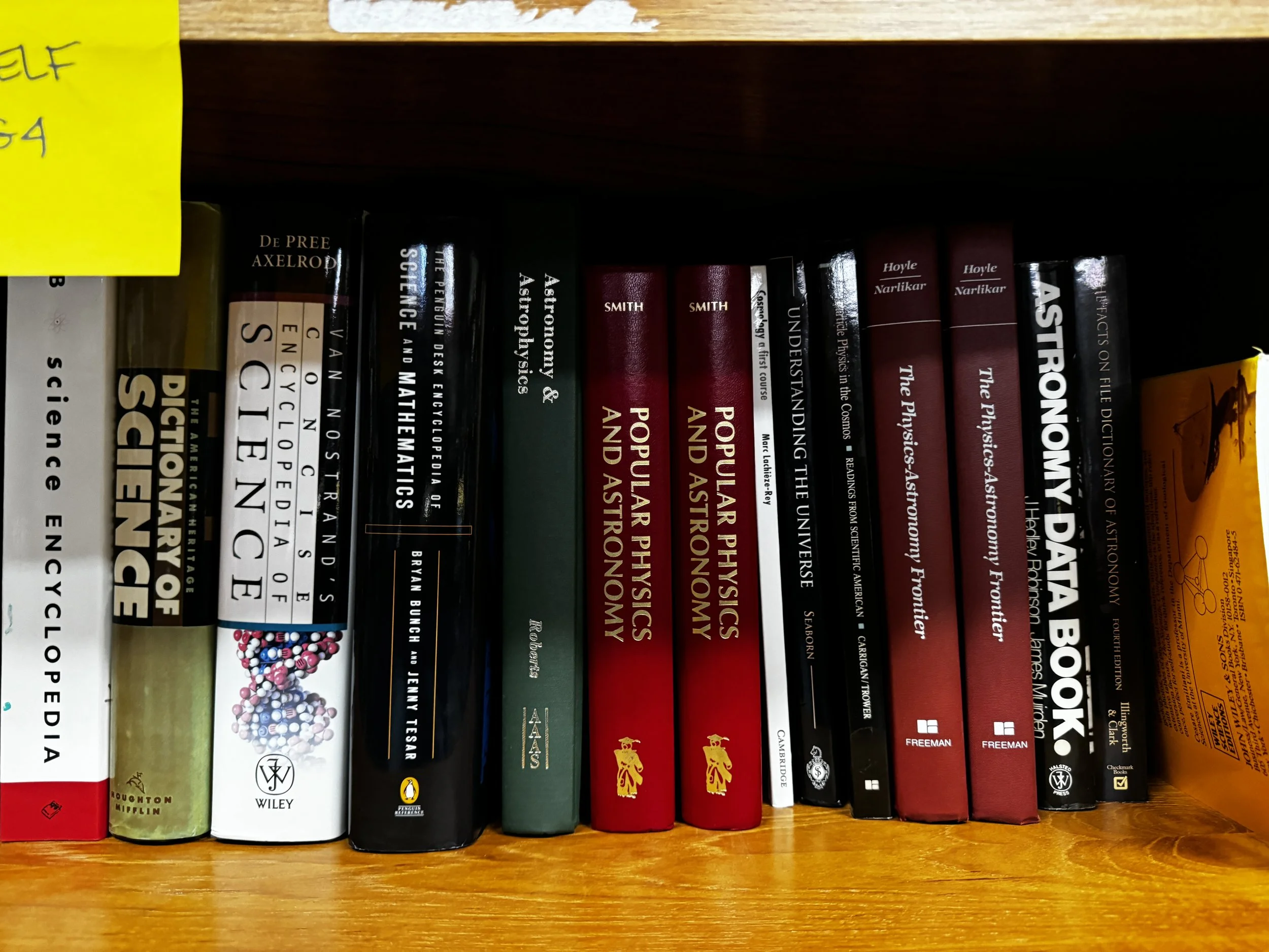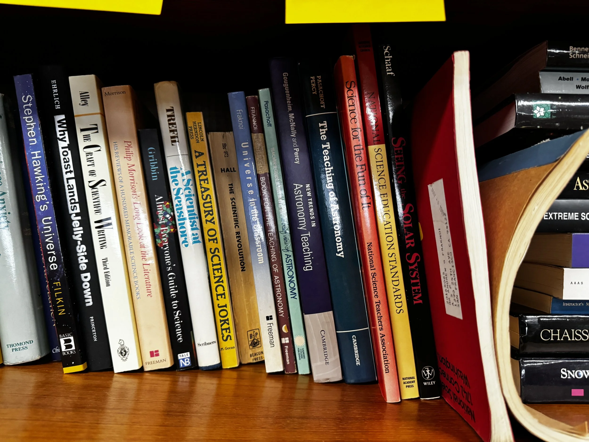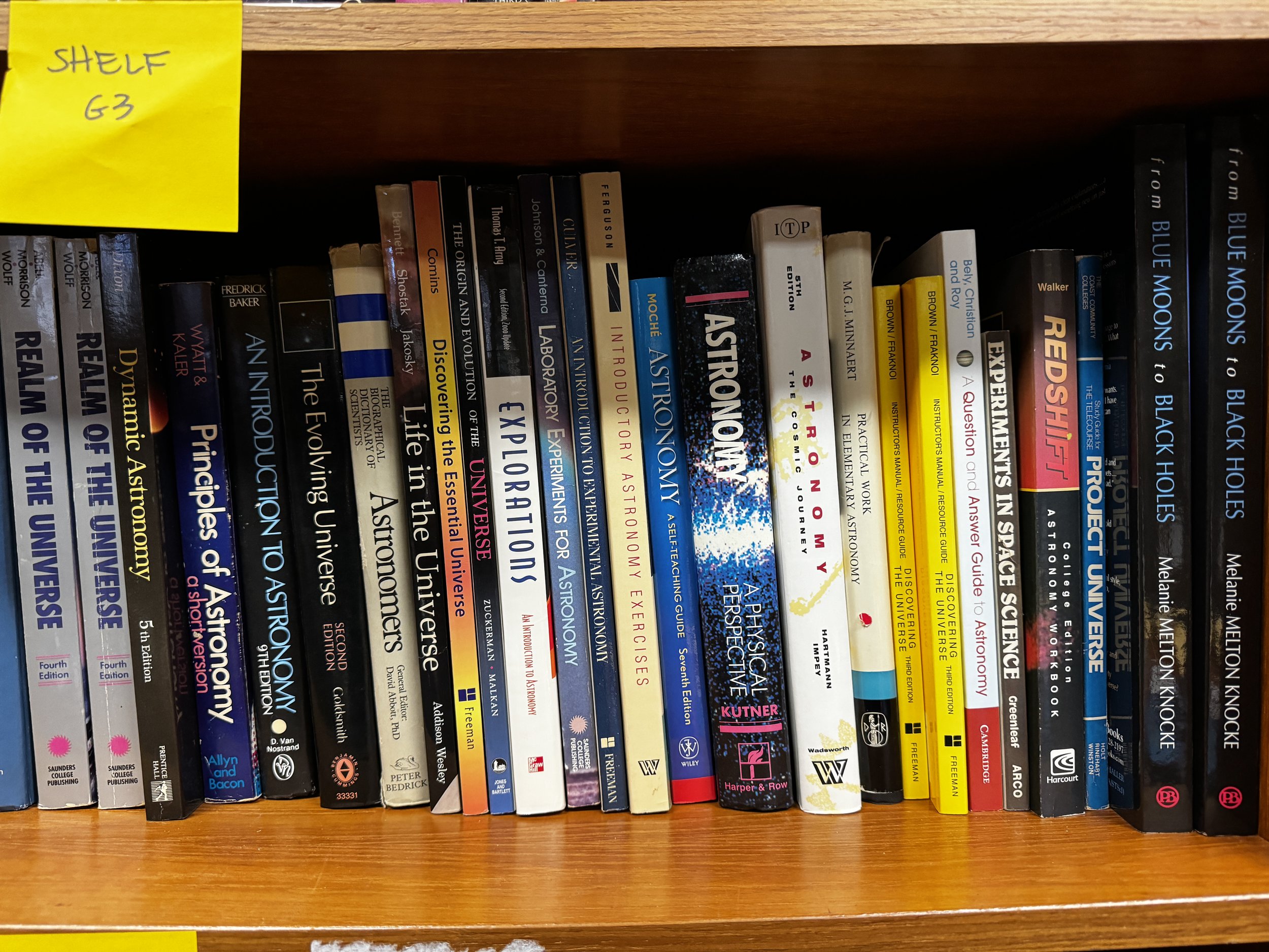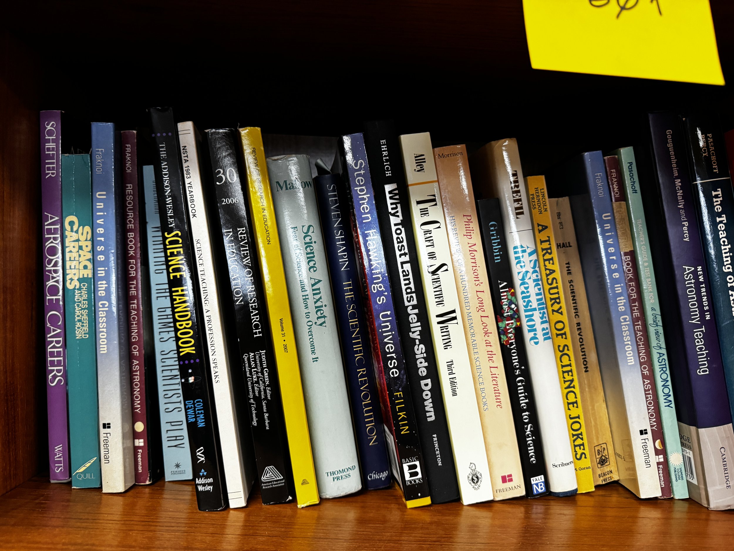 Bookcase G includes: educational texts for science, science teachers, intro astronomy, intro physics, cosmology, and math.