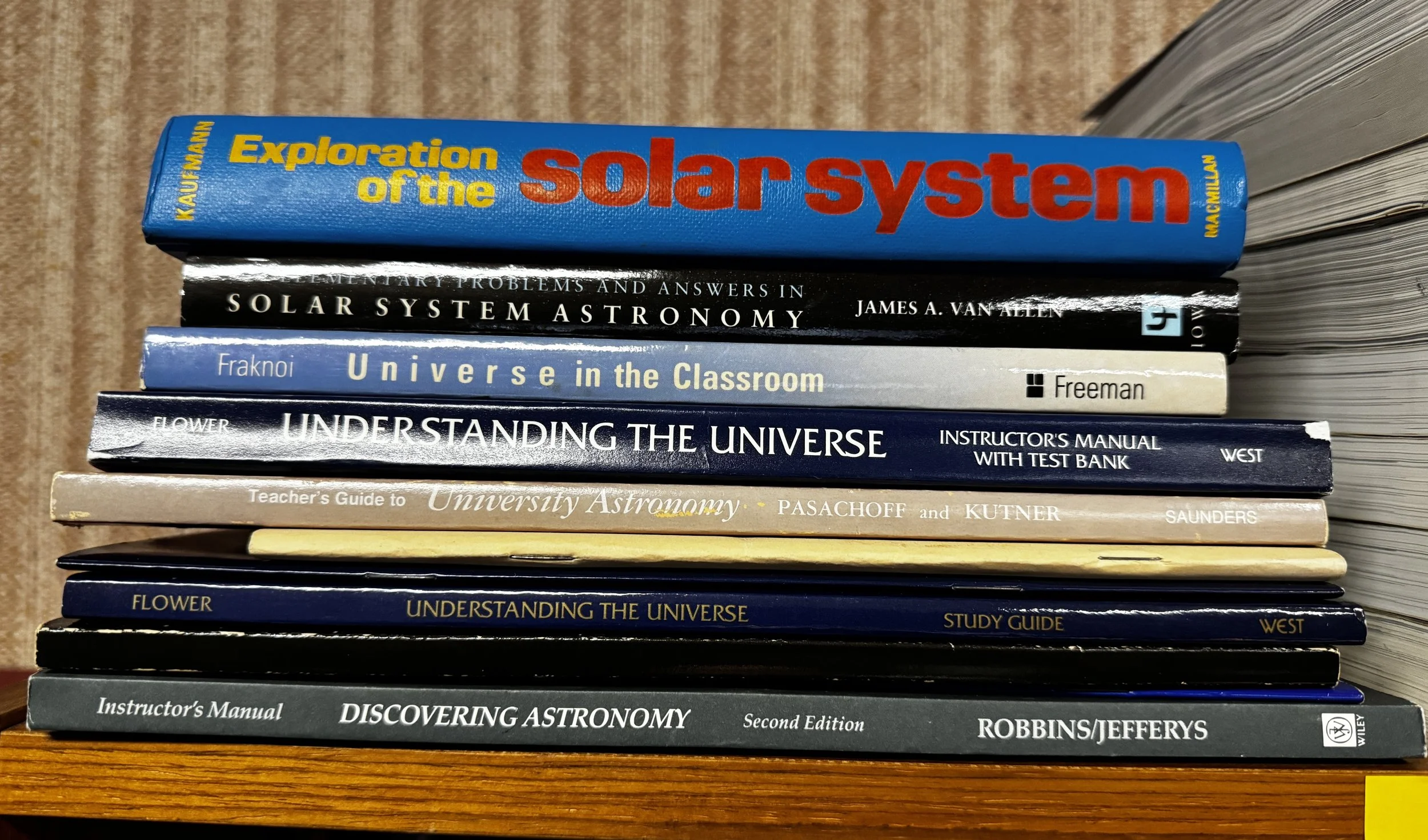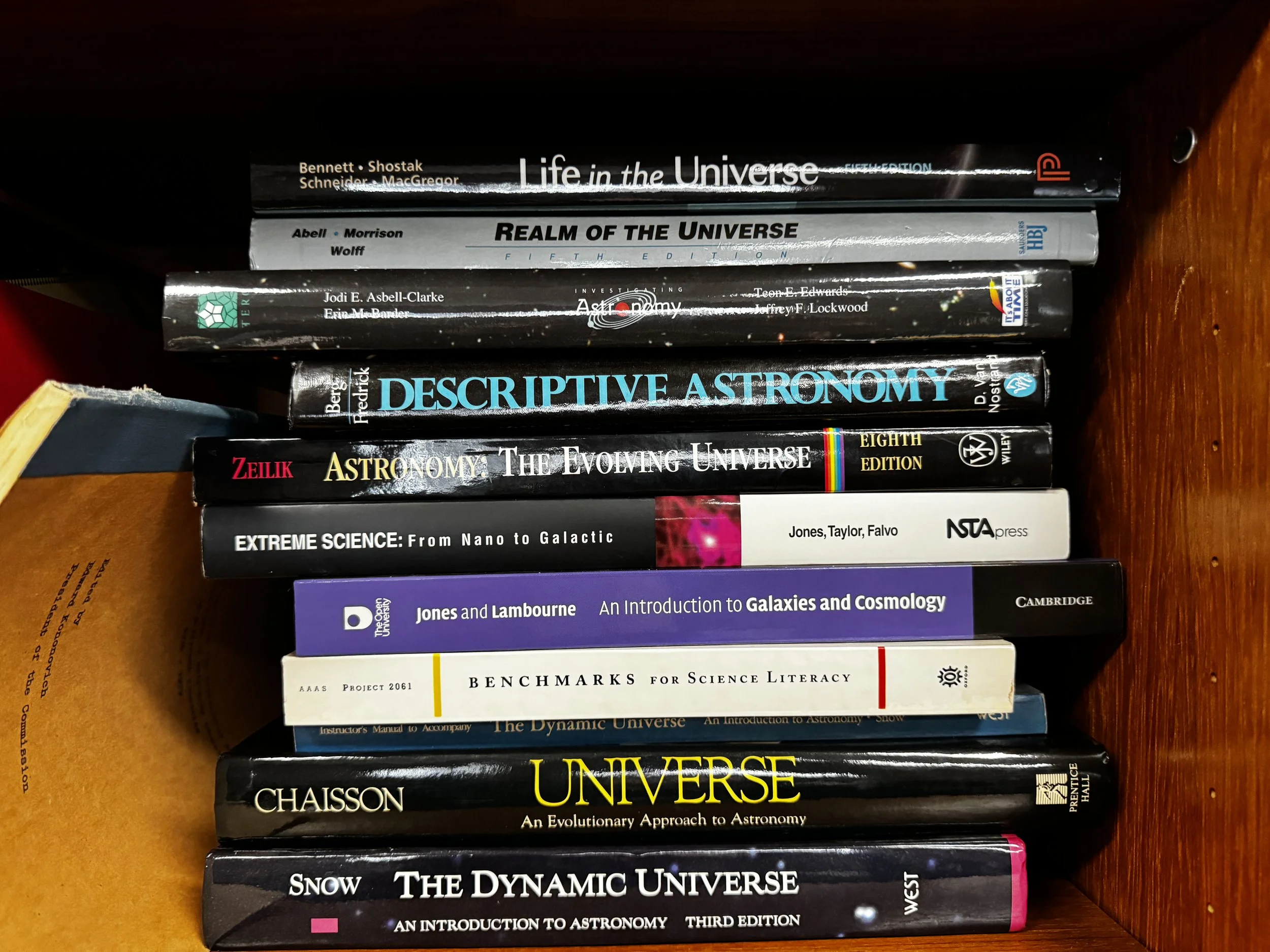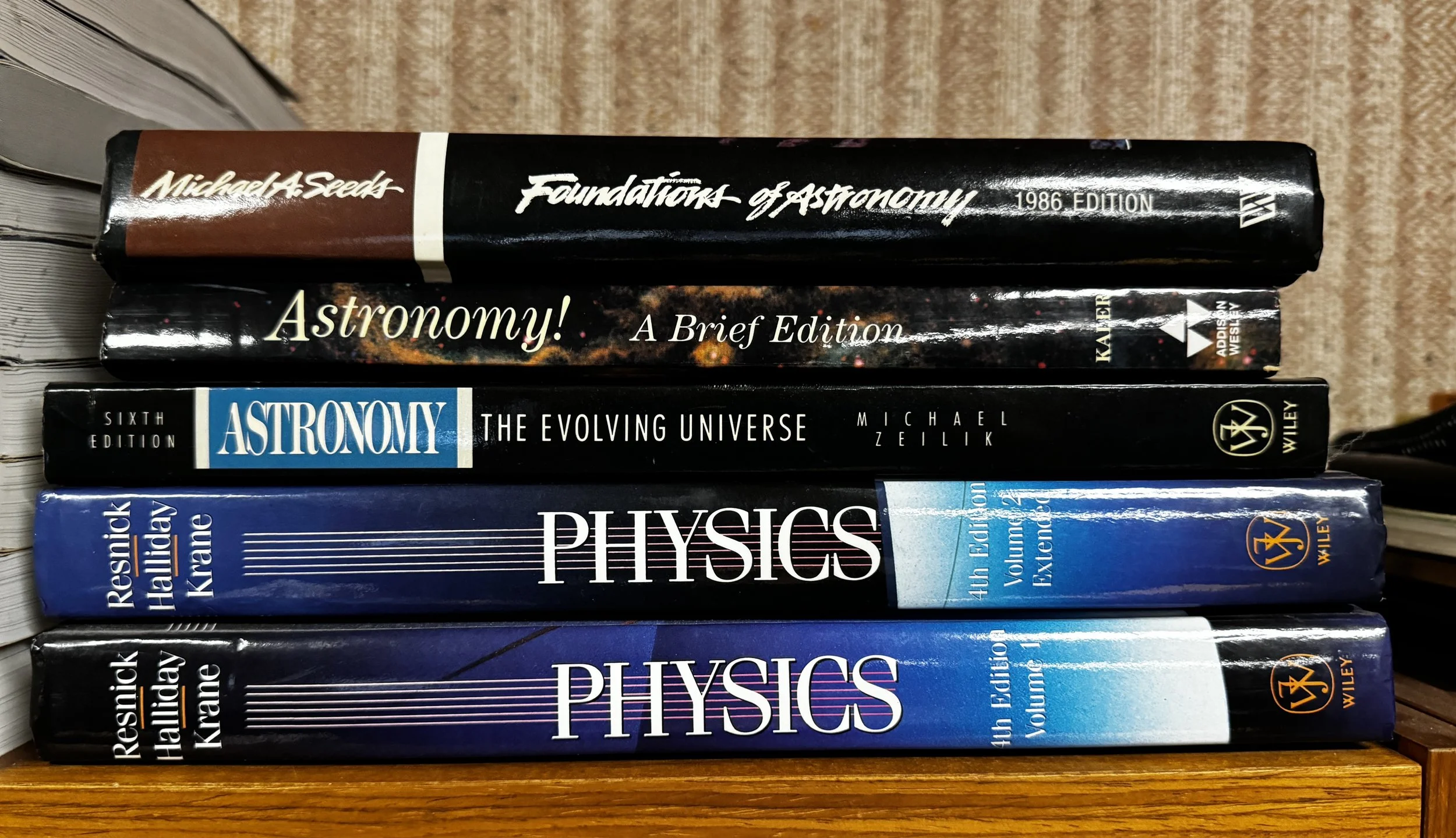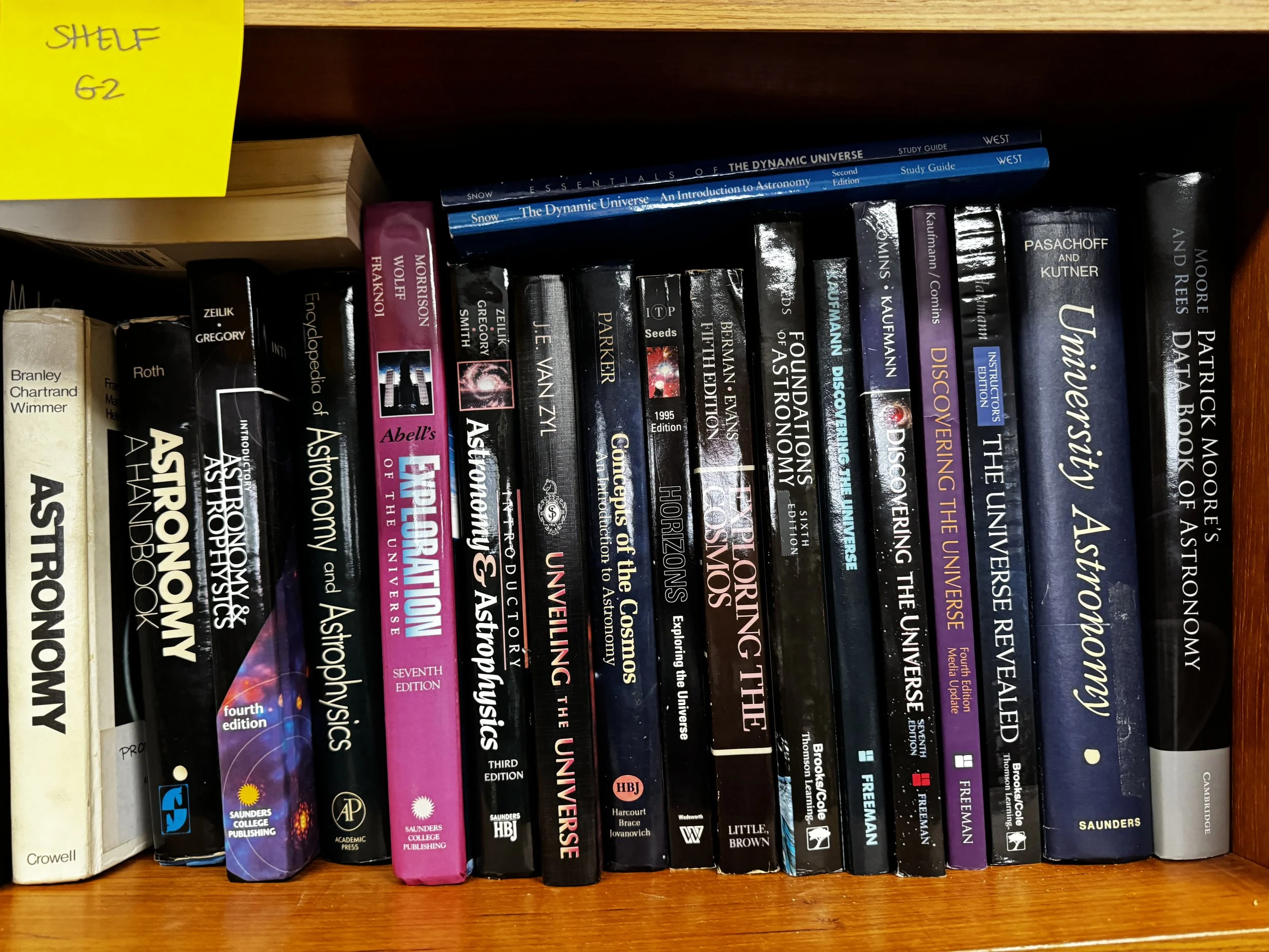 Bookcase G includes: educational texts for science, science teachers, intro astronomy, intro physics, cosmology, and math.