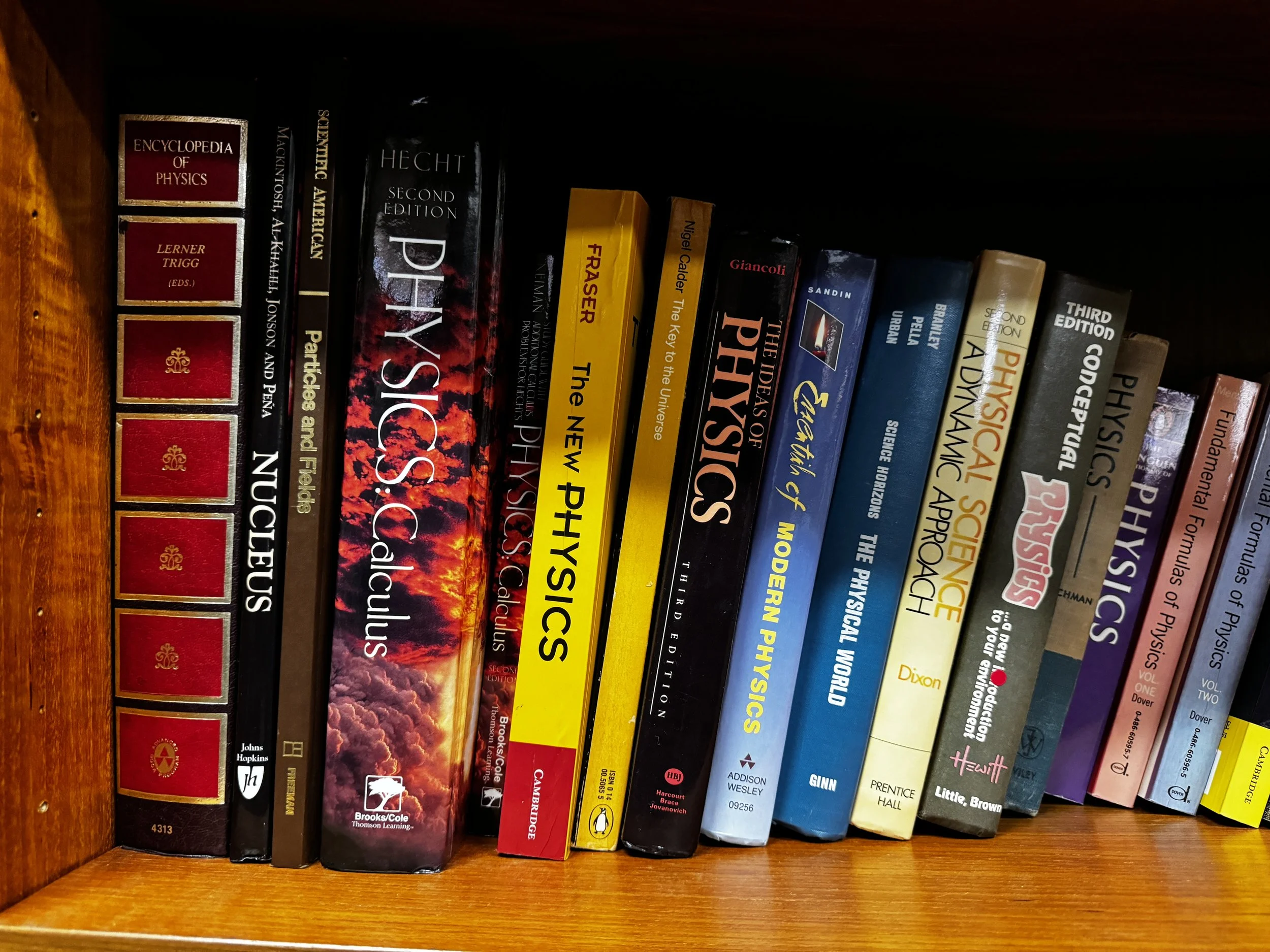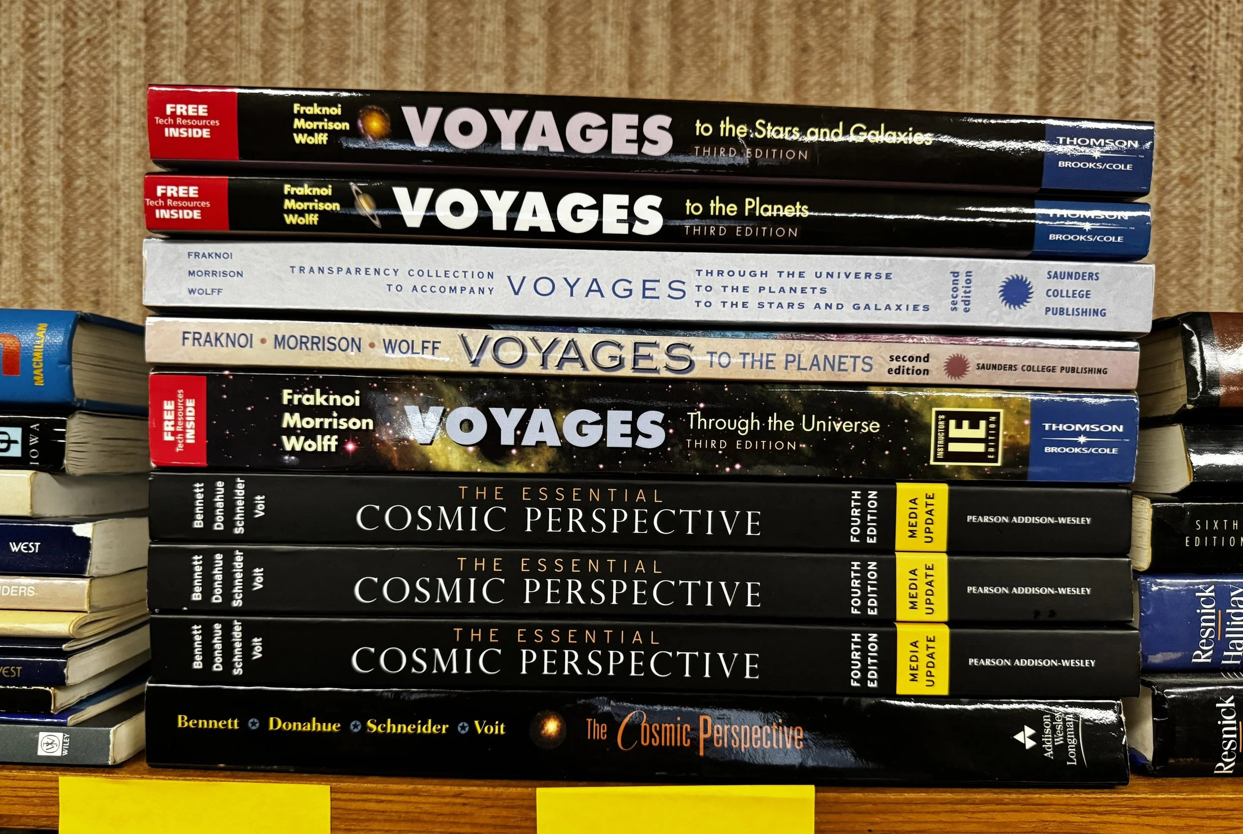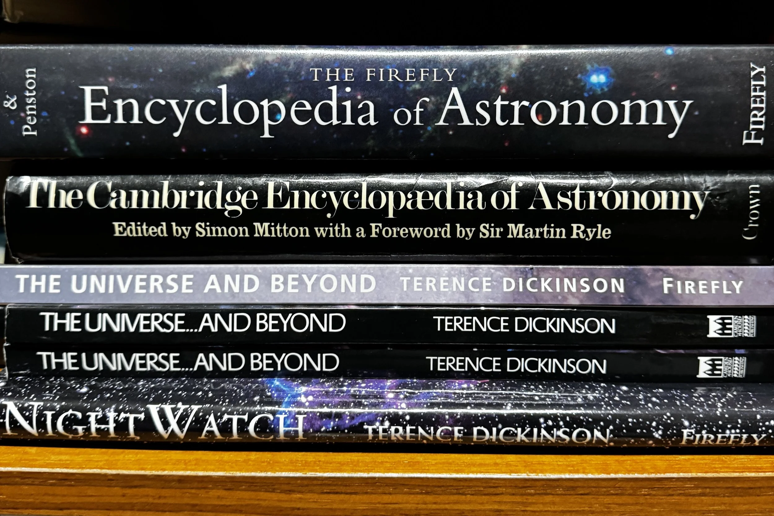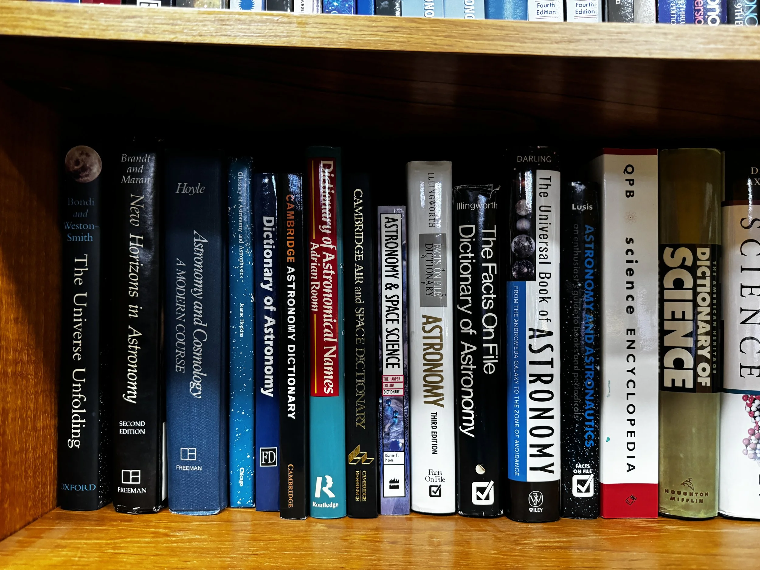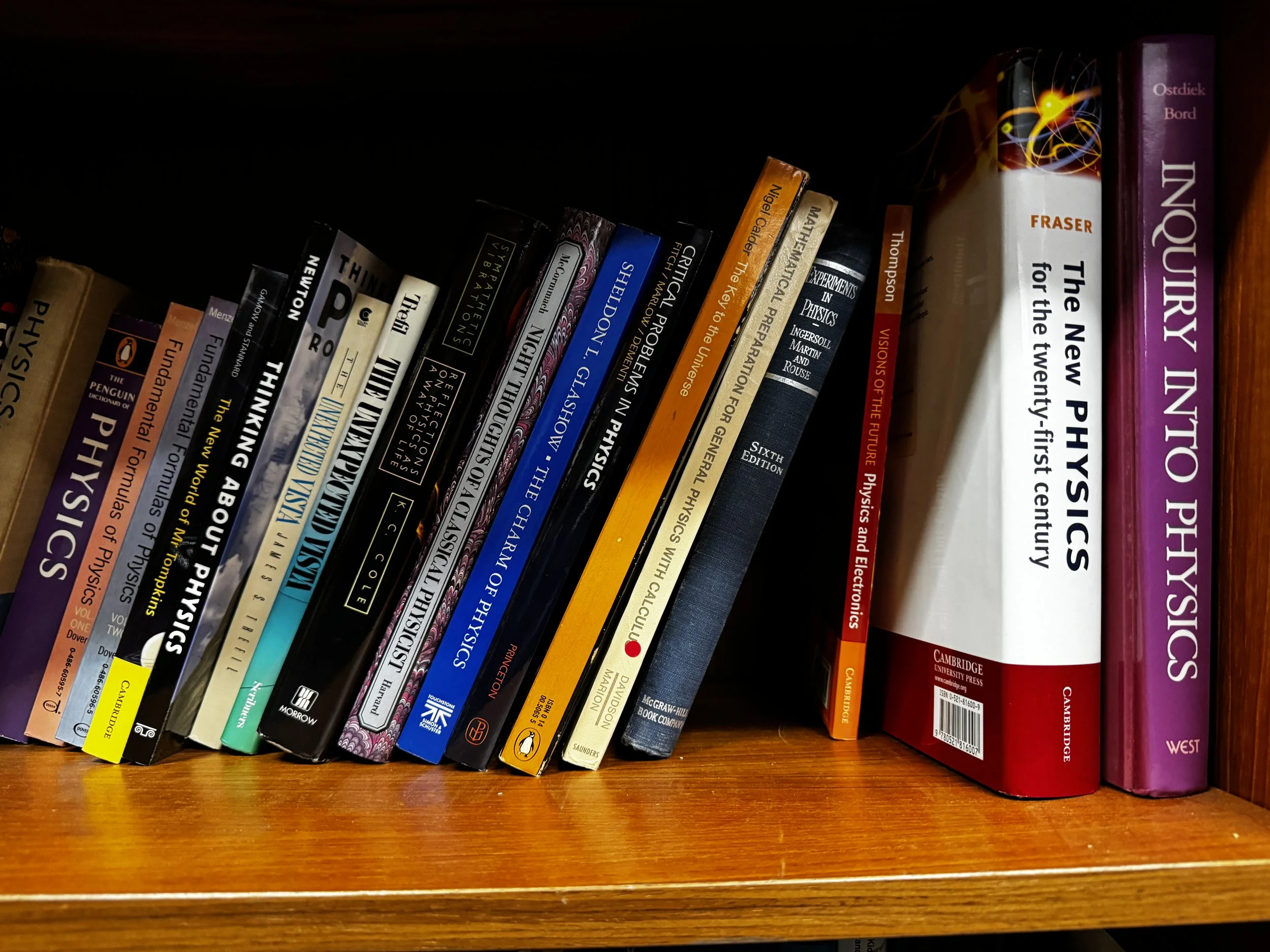 Bookcase G includes: educational texts for science, science teachers, intro astronomy, intro physics, cosmology, and math.