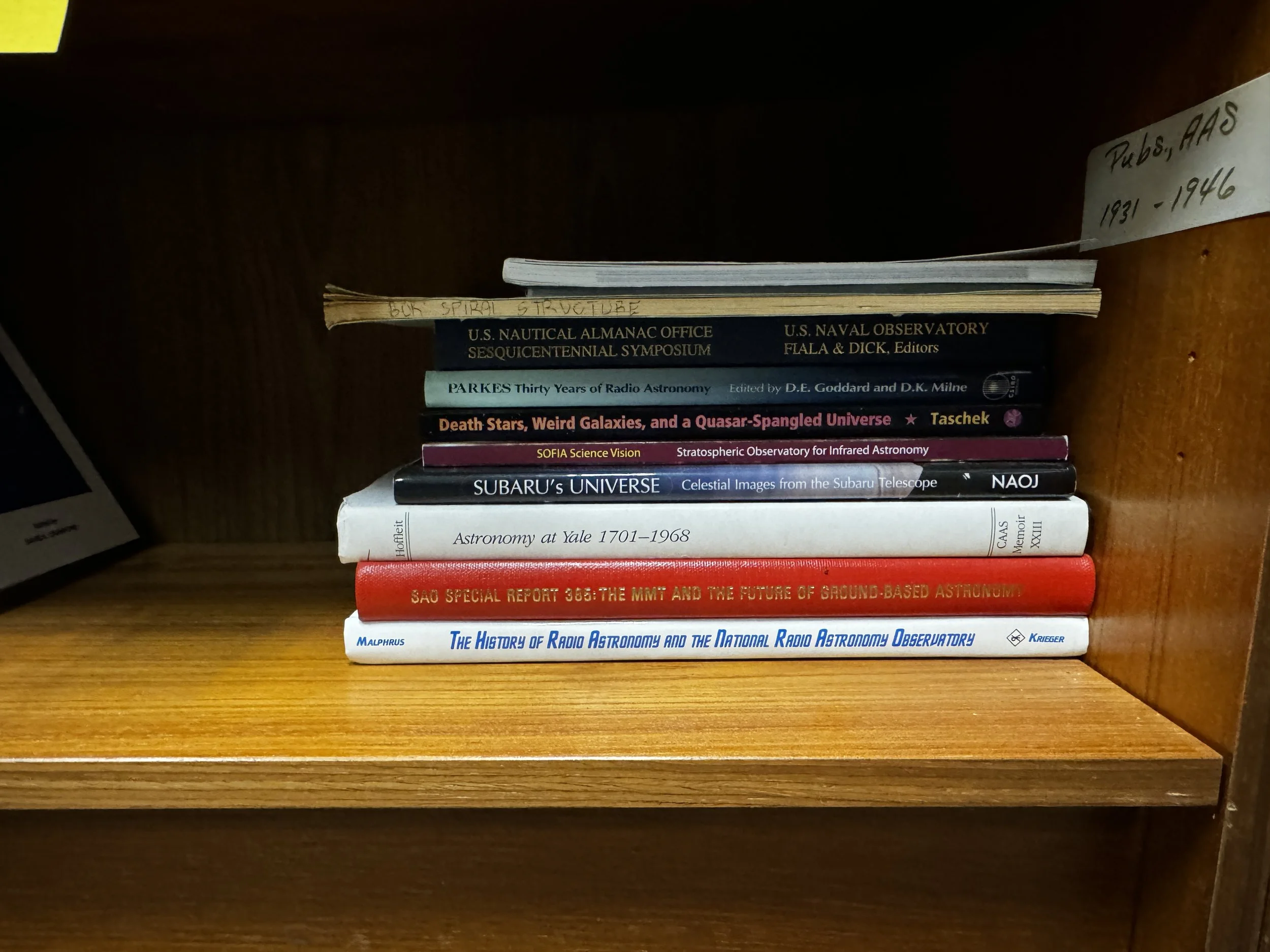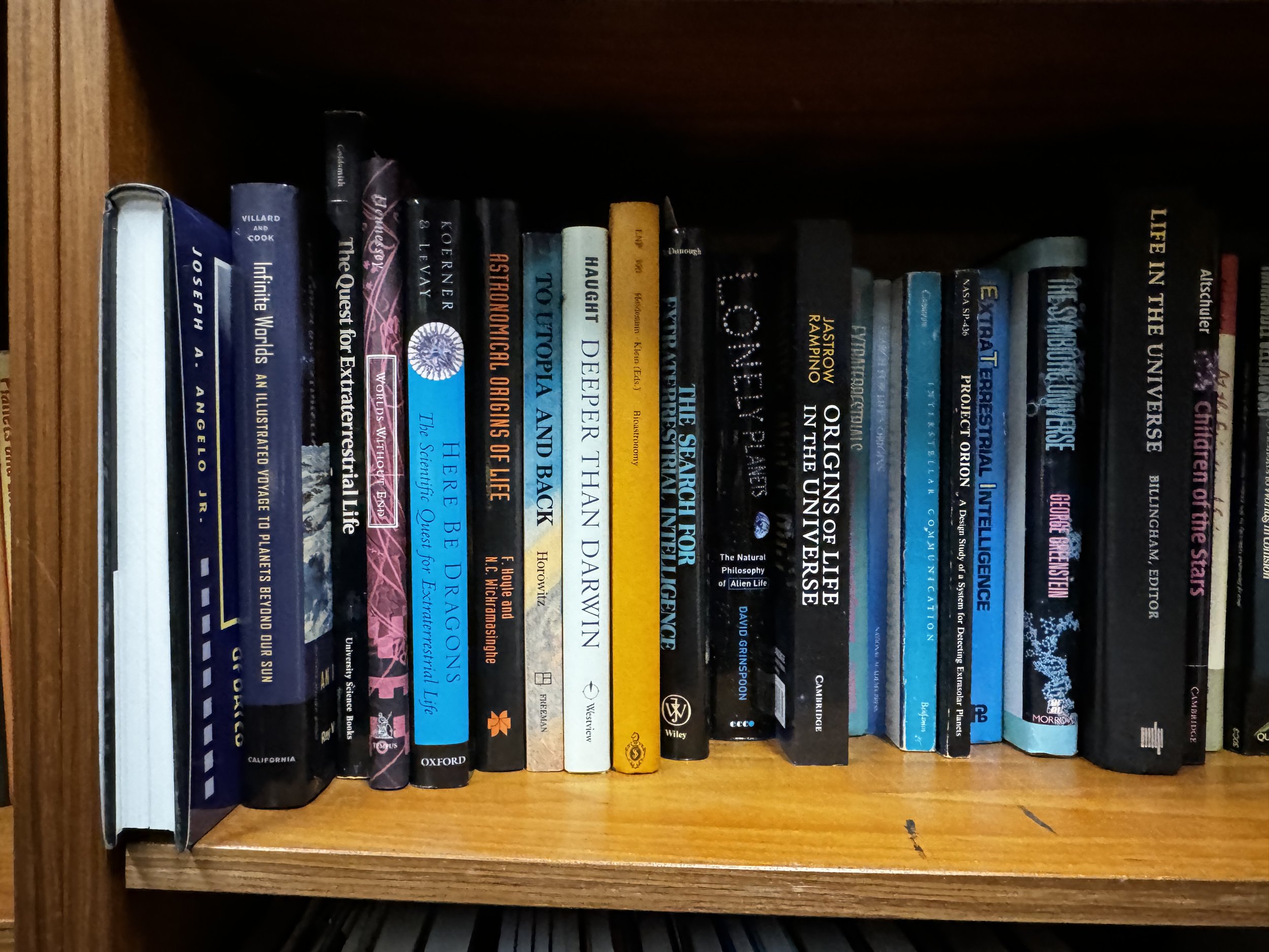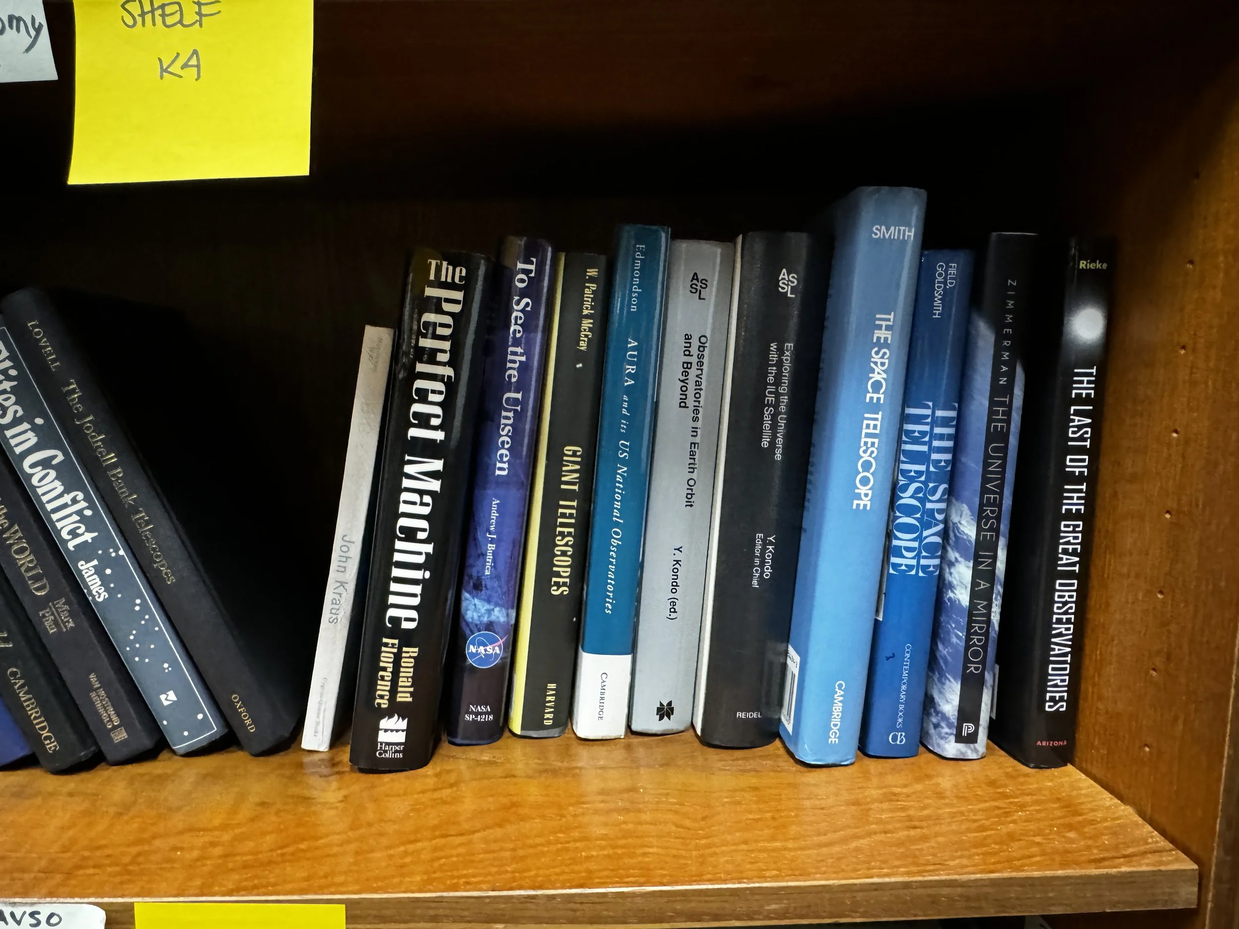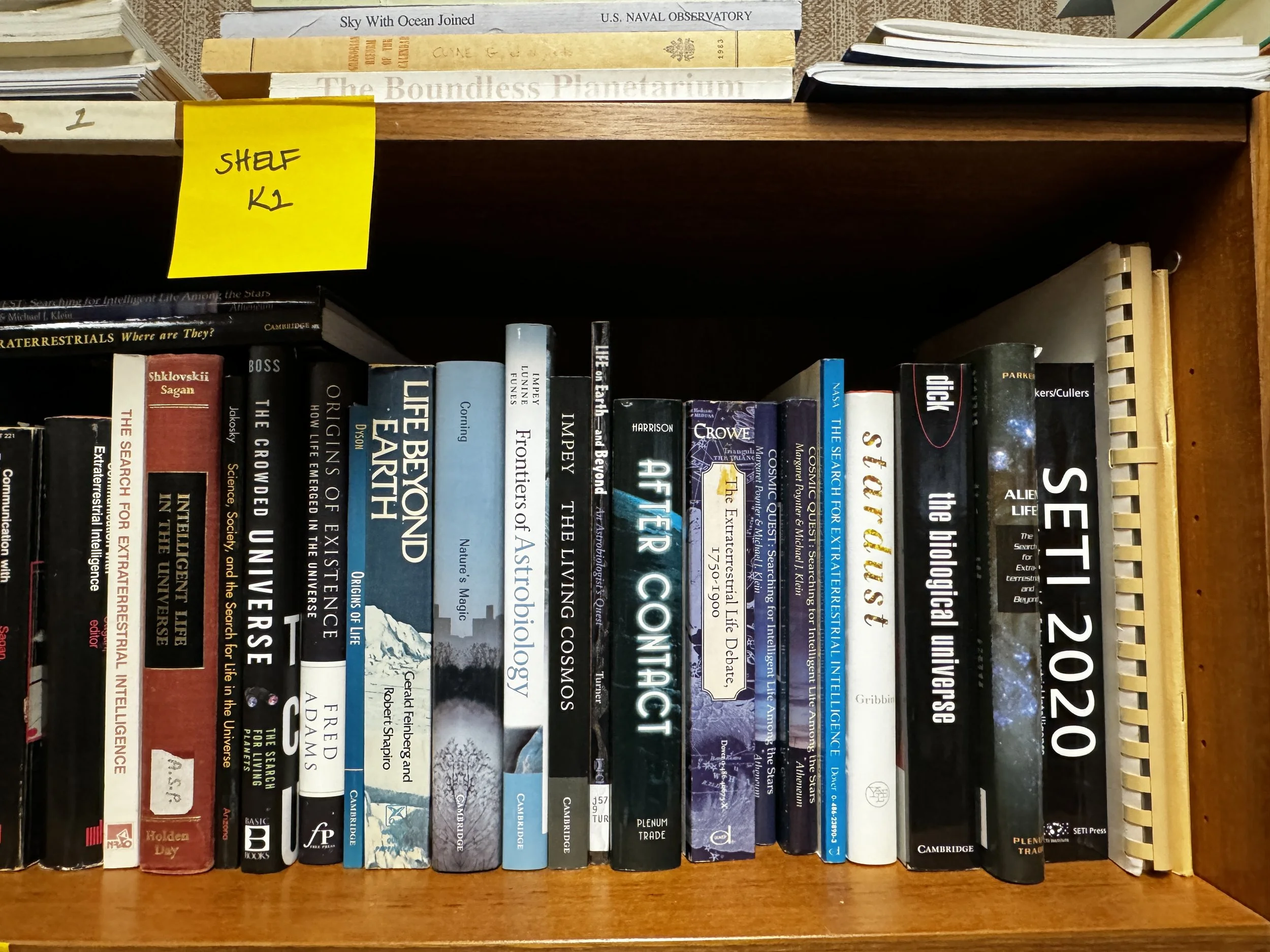 Bookcase K includes: SETI, extraterrestrial life, history of telescopes and observatories, and modern observatories.