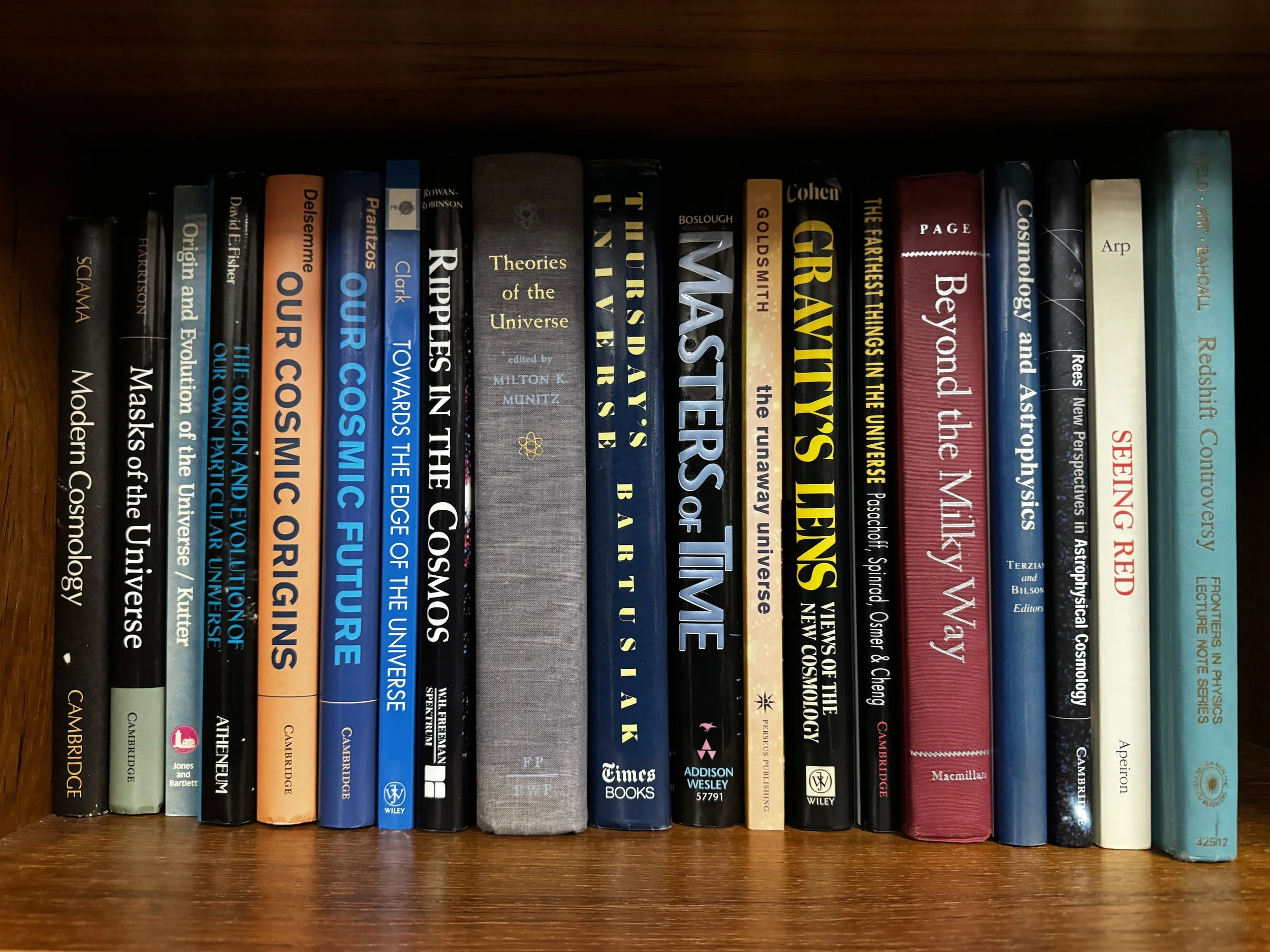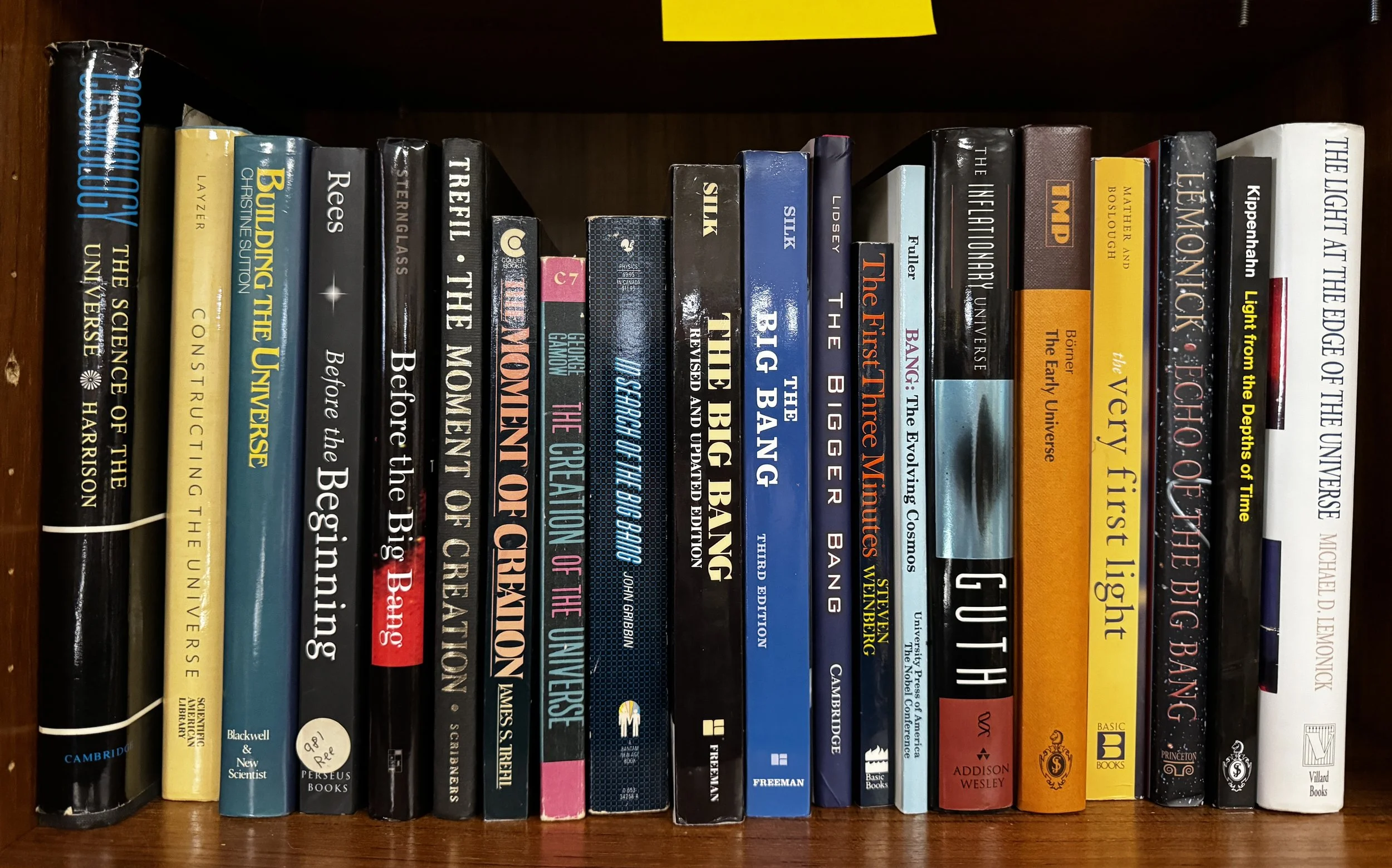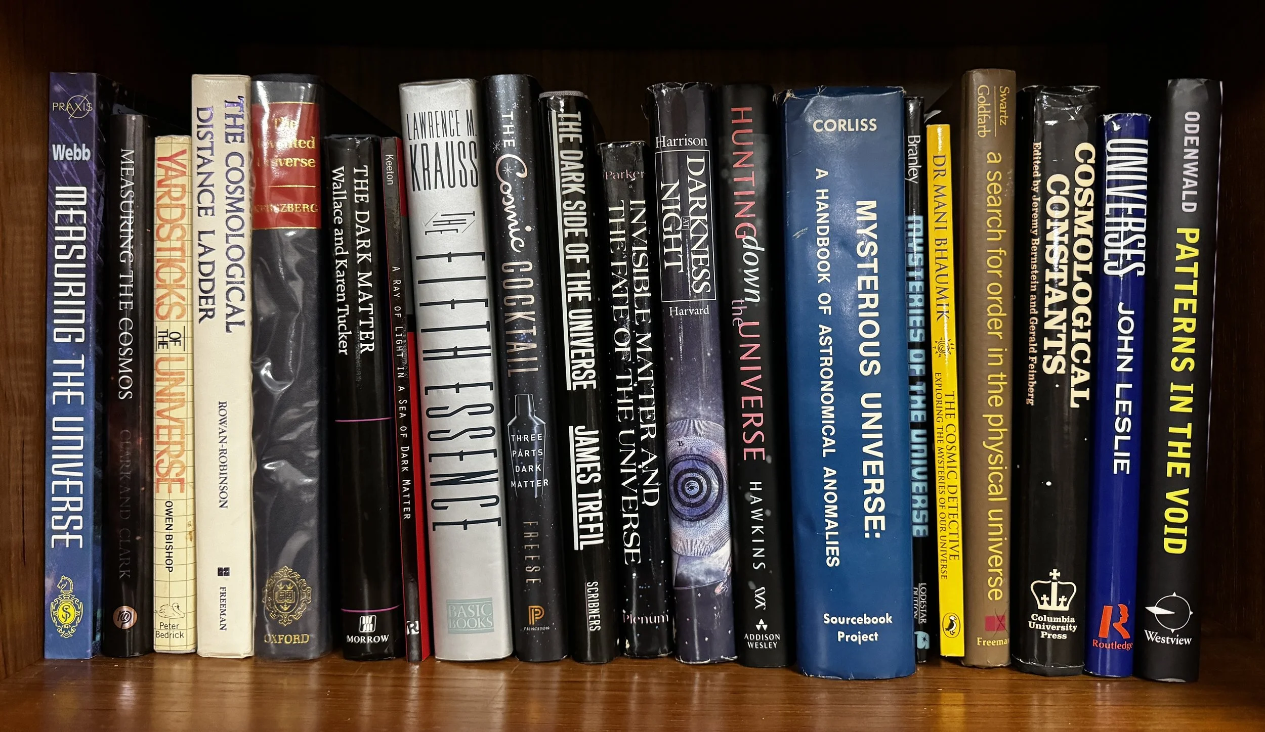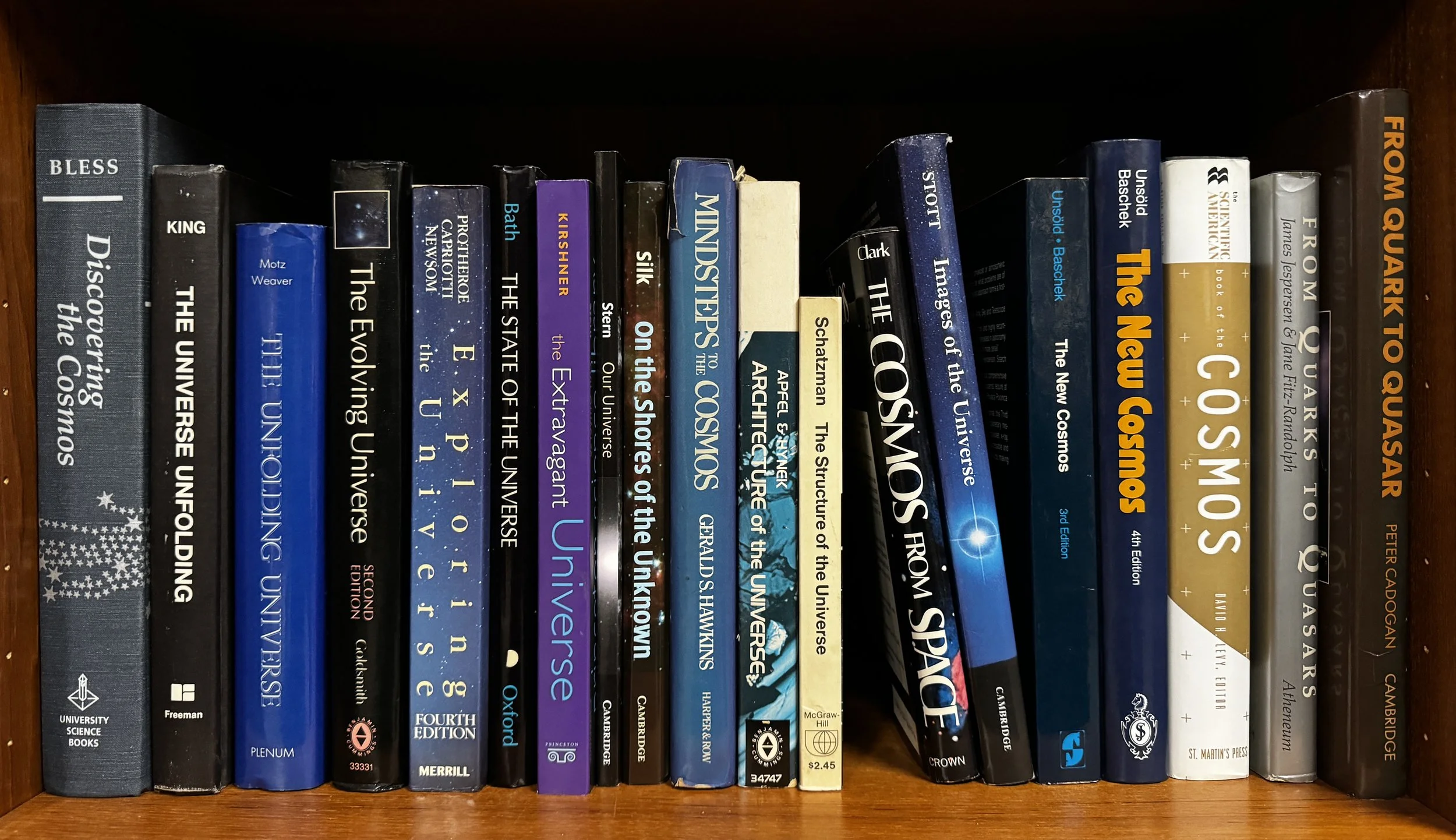 Bookcase A includes: the Universe (beginning, mysteries, evolution, future), cosmology, dark matter, and more.