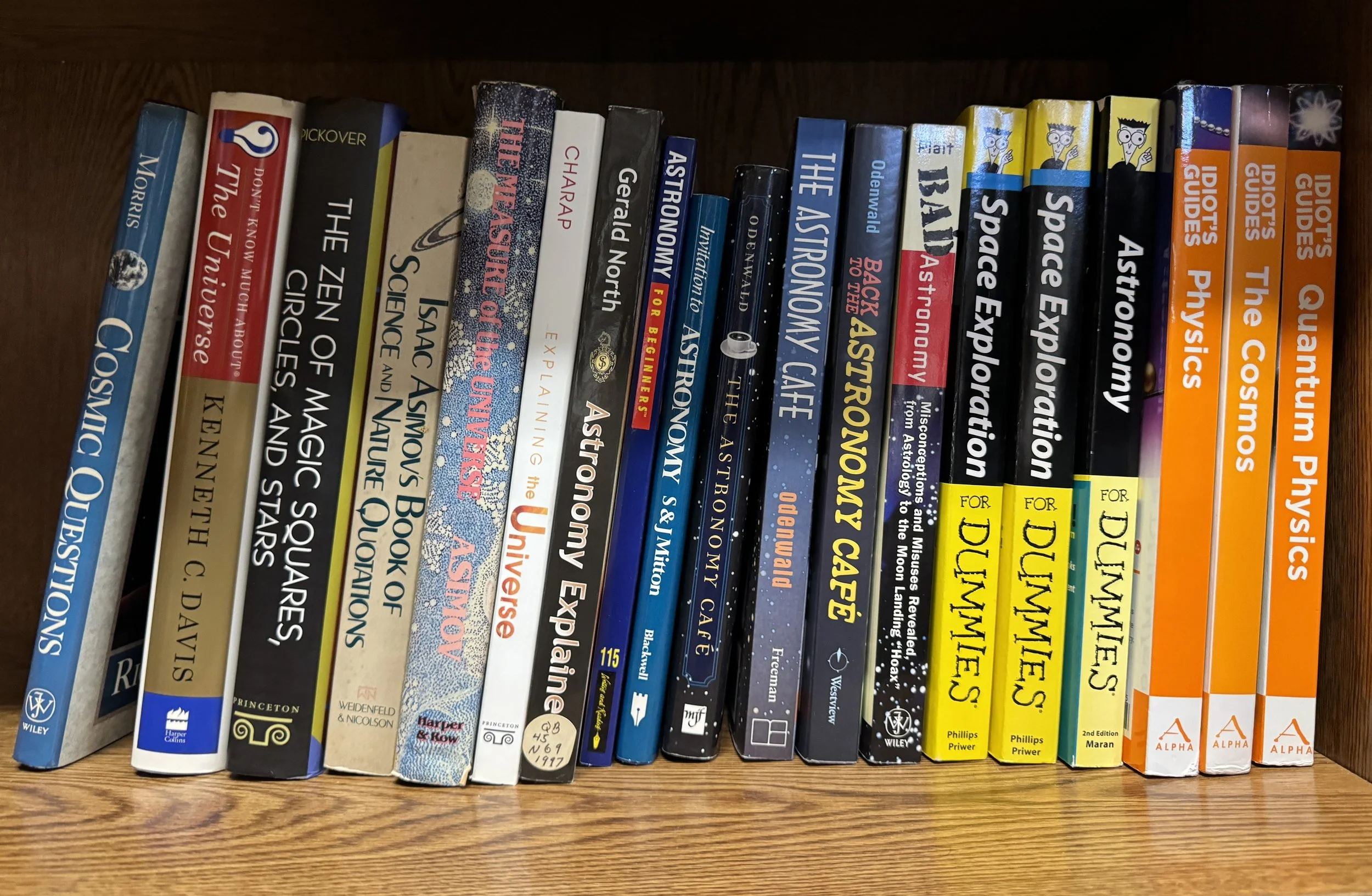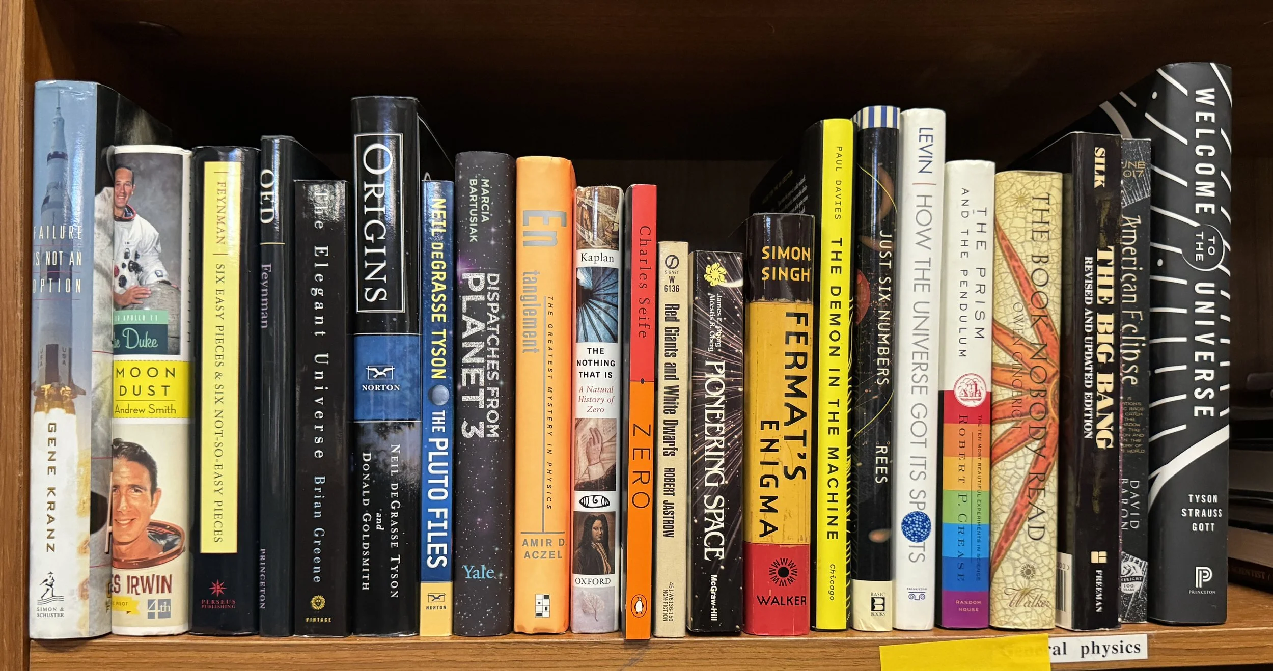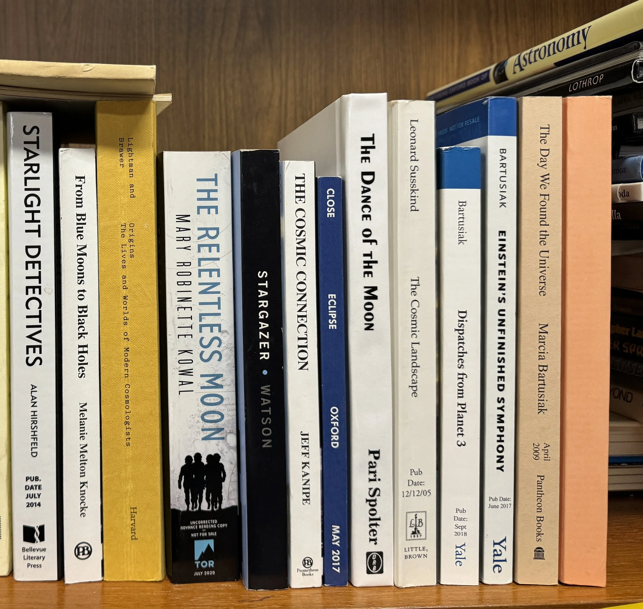 Bookcase H includes: popular mainstream science books/authors, astronomy for general audiences, uncorrected proofs,