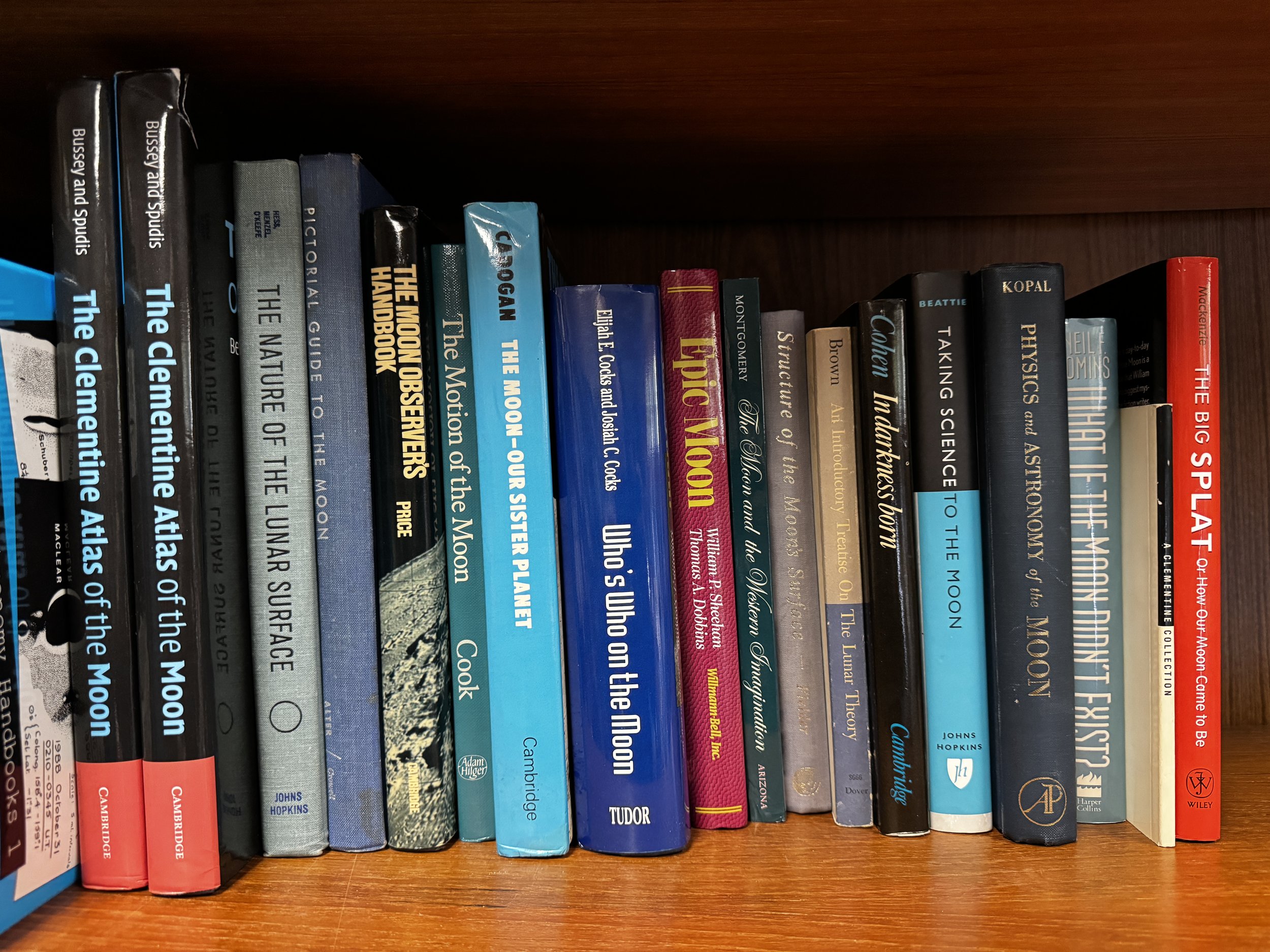 Bookcase J includes: Earth, Earth Science, the Moon, history of humans and the cosmos, philosophy of science/astronomy, and life outside our solar system.