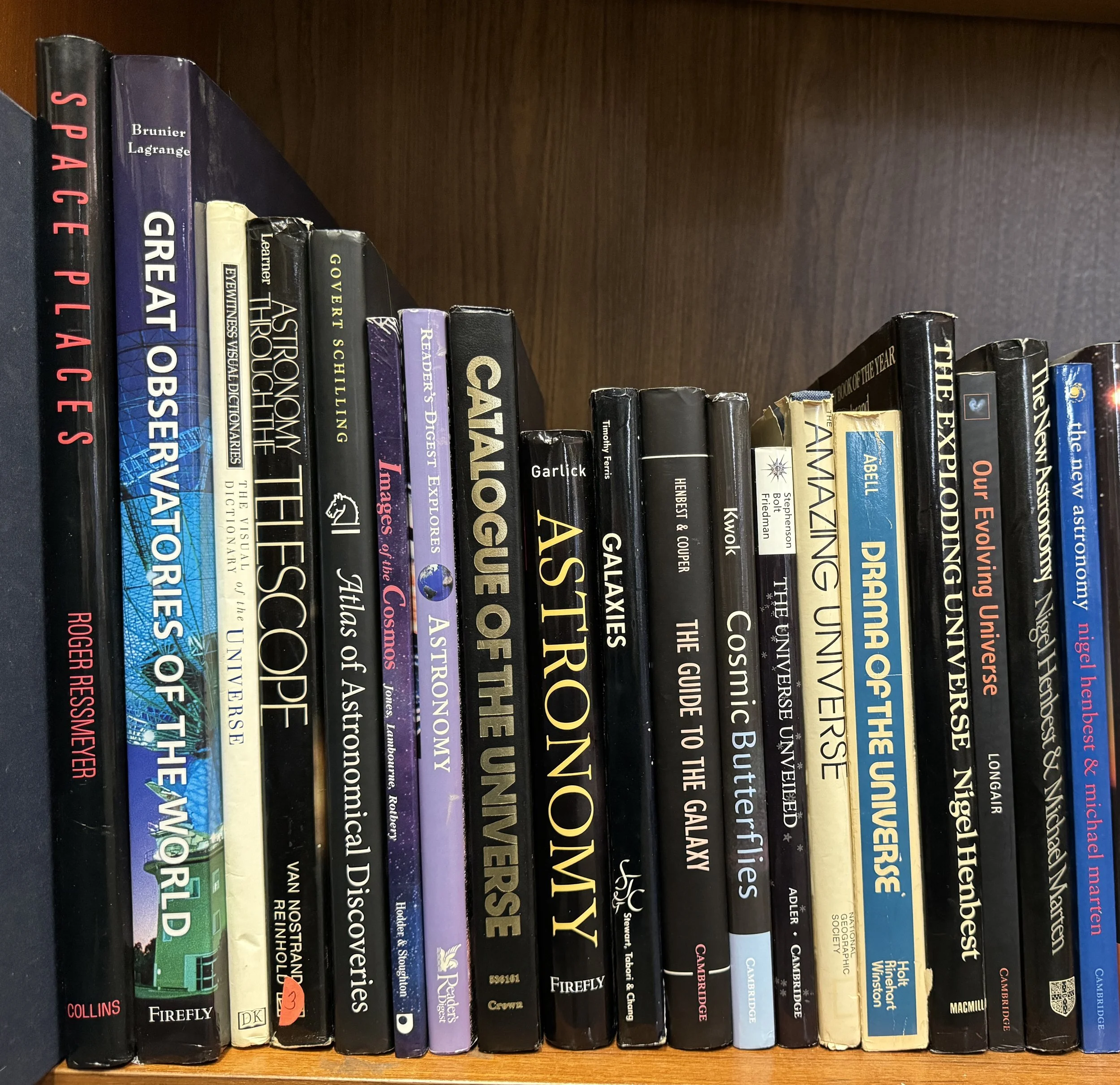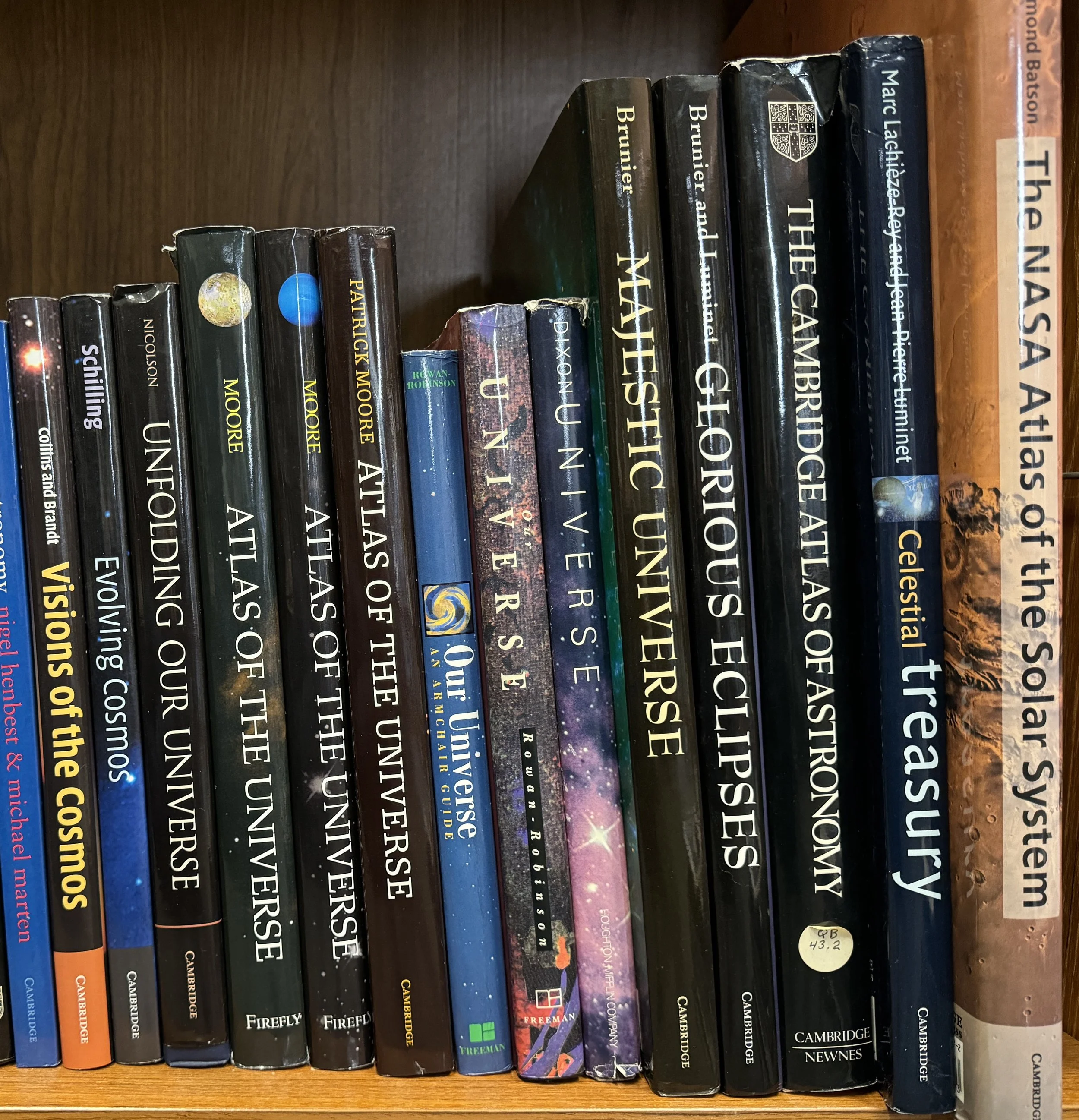 Large format books include coffee table books, photo atlases, and encyclopedias about astronomy, space, and space exploration.
